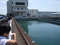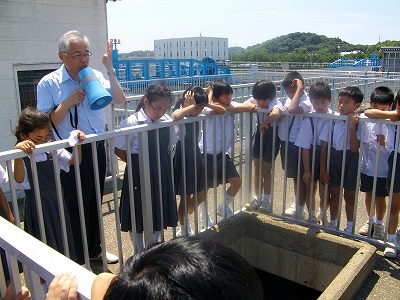 映像で学んだ後は、実際に場内の取水口や沈殿池、ろ過池などを見学しました。