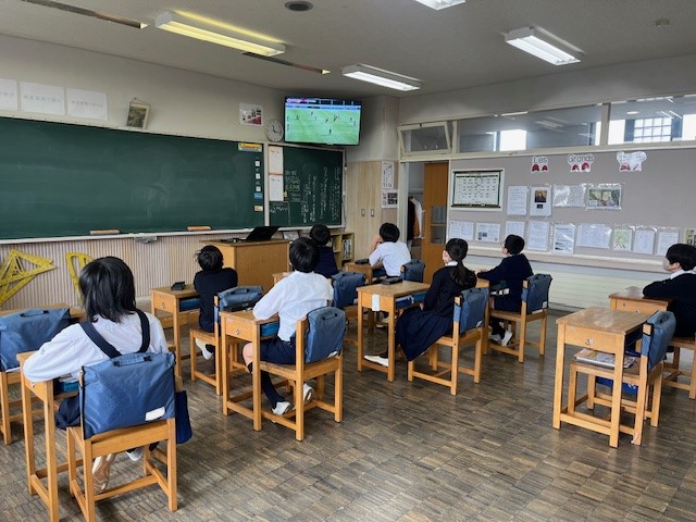 また、女子サッカー部の監督が、かつて小学校で学級担任をしていたこともあり、先生の姿や、普段学園内で見かける先輩方の姿が映るたびに、子どもたちは大喜びで応援していました。画面に向かって声援を送る姿からは、学園のつながりや一体感が強く感じられました。